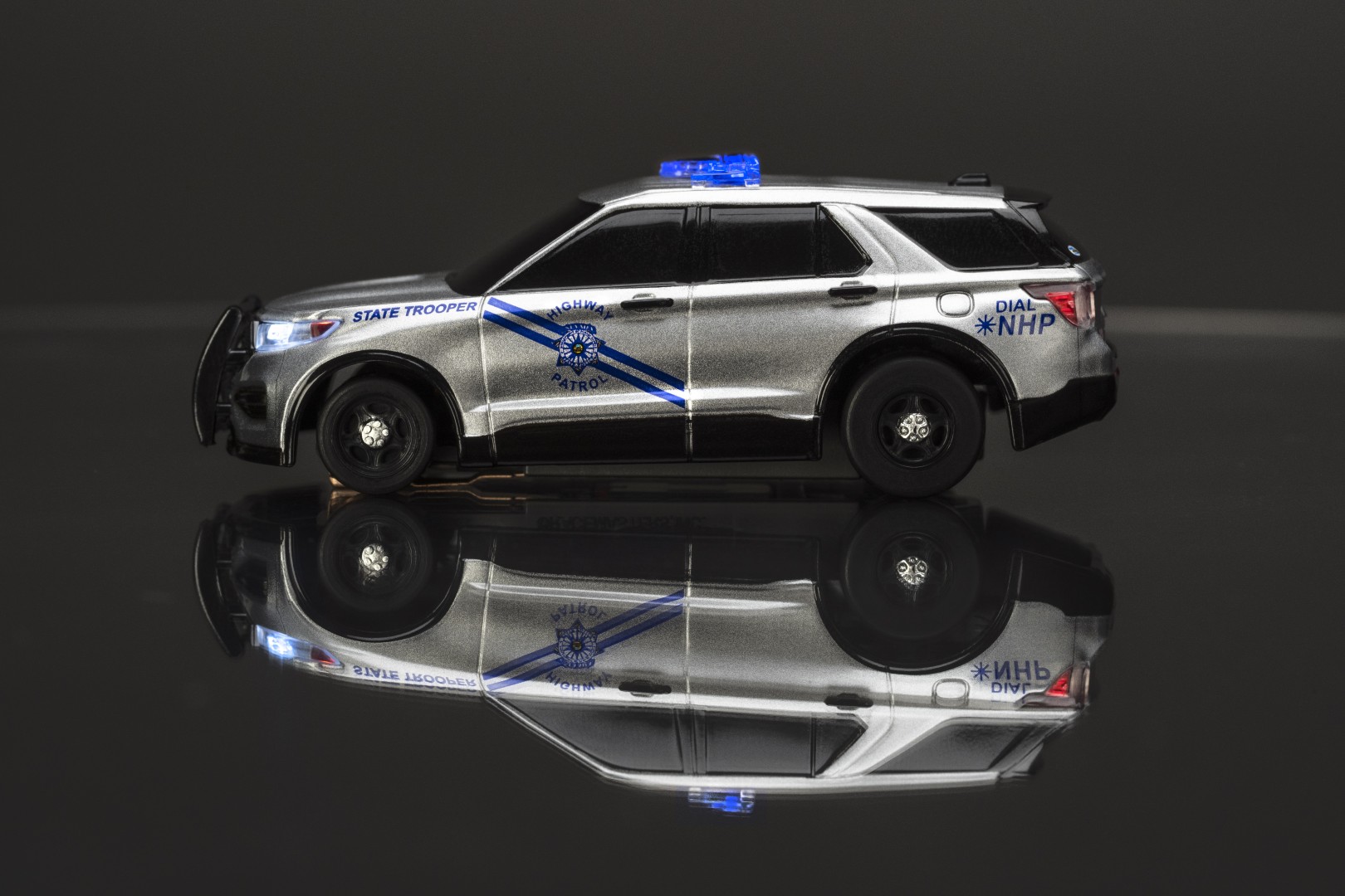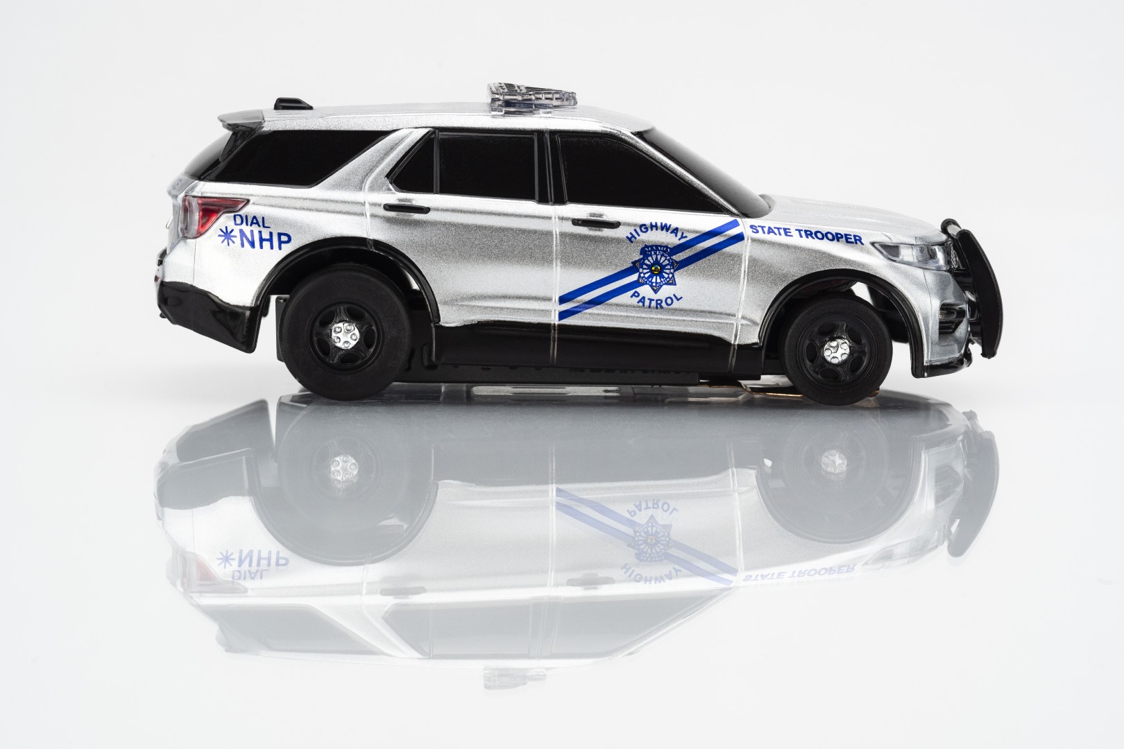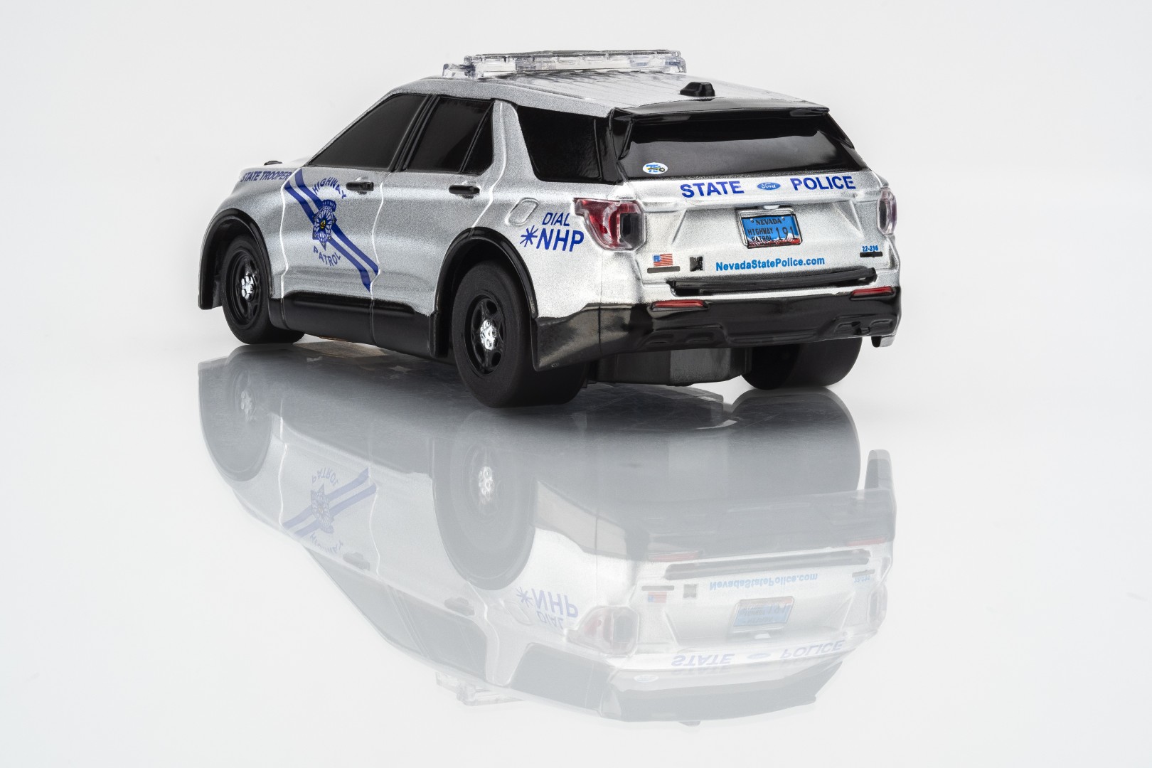 The car’s body design is also totally brand new to AFX being one of the first modern day SUV style cars released in decades. The lights are enhanced by the silver sparkle of the car’s paint. The official highway patrol car identifying elements are presented with precision, like the Nevada State badge on the car doors and the standard issue NHP license plate.