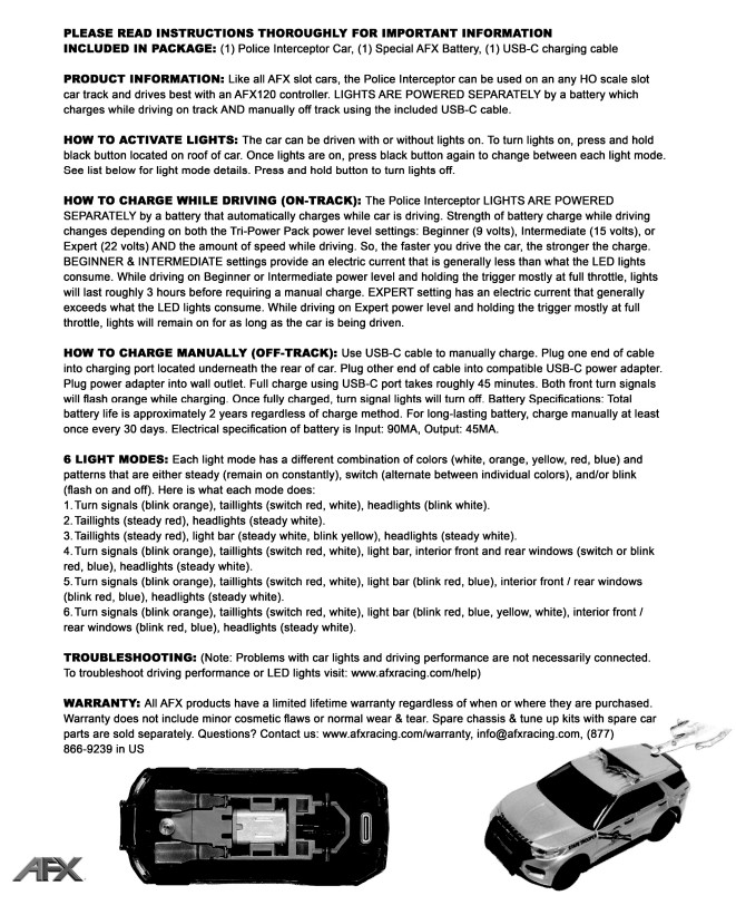 For a detailed explanation of all light modes and usage information, please see the Instructions included with the car or visit the AFX product page.